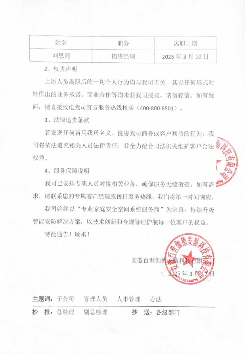 上述人员离职后的一切个人行为均与我司无关,其以任何形式对外作出的业务承诺、商业合作等均未获我司授权,请勿轻信。如有疑问,请直接致电我司官方服务热线核实(400-800-8501)。